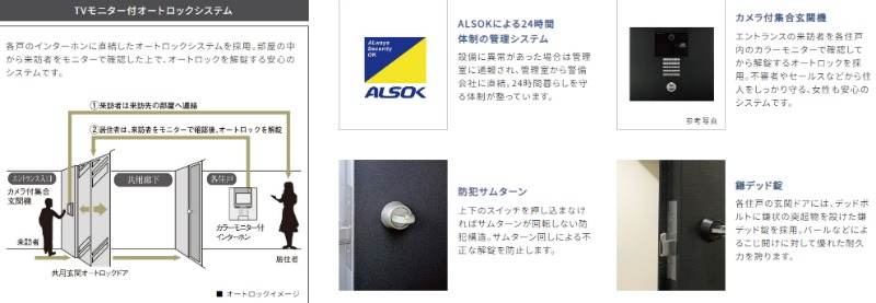| 設備 | ガス(都市ガス)、24時間緊急対応、インターホン(TVモニター付き)、防犯カメラ、人感センサー、ディンプルキー、ダブルロック、オートロック、防犯ガラス、宅配ボックス、専用ゴミ置き場(24Hゴミ出し可)、駐輪場、バイク置き場、日当り良好、眺望良好、通風良好、フローリング、全居室フローリング、照明器具、間接照明、ベランダ・バルコニー、収納スペース、クローゼット、クローゼット数(1)、玄関収納、下駄箱、バス・トイレ別(別室)、シャワー、浴室乾燥機、給湯、温水洗浄便座、ウォームレット、洗面台、洗面所独立、洗濯機置き場(室内)、コンロ設置済、コンロ口数(2)、コンロ種類(都市ガス)、システムキッチン、冷房のみ、エアコン、エアコン台数(1)、24H換気システム、BS、CS、CATV、光ファイバー | ||